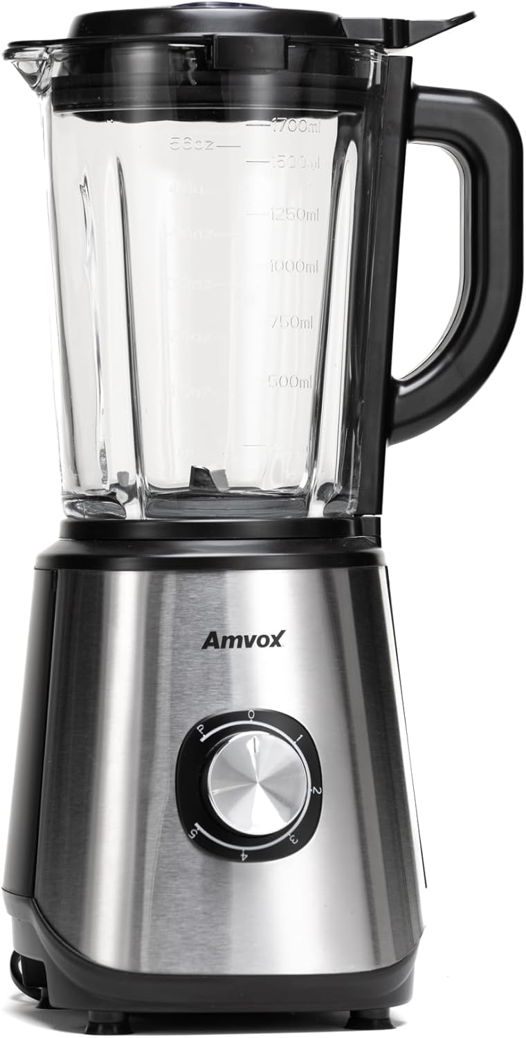 O Liquidificador Amvox ALQ 0209 tem 800W de potência, 5 velocidades com pulsar, lâmina de aço inoxidável, jarra de vidro 1,7L, tritura gelo e alimentos duros
