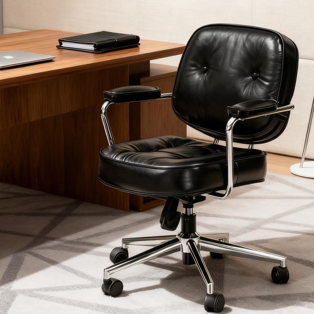 Cadeira de Escritório Executiva em Couro PU com Apoio Lombar Baixo, Ergonômica, Altura Ajustável, Braços Acolchoados, Base Giratória 360° e Rodízios Para Casa Preto/Bege/Castanho