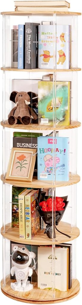 - Estante giratória de 360°, torre de prateleira giratória de 5 camadas com madeira maciça e acrílico transparente, estante giratória redonda para sala de estar, quarto e escritório
