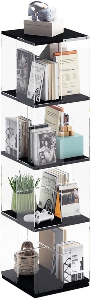 Grande capacidade: todas as prateleiras de 4 camadas são divididas por hastes de acrílico transparente. Cada prateleira tem uma altura de 31 cm, capaz de armazenar uma quantidade significativa de livros, artesanato, plantas verdes, molduras, lembranças, ornamentos, calendários, controles de jogos, fones de ouvido, etc