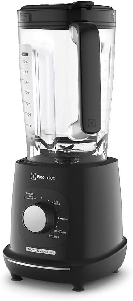 Com o Liquidificador Electrolux 1300W 3,2L Efficient com TriForce 12 Velocidades Preto (EBL1300), você tem mais agilidade nos preparos, eficiência em cada etapa e resultados consistentes para facilitar sua rotina na cozinha. ------ Prepare-se para revolucionar sua cozinha com o Liquidificador Electrolux 1300W 3,2L Efficient com TriForce 12 Velocidades Preto (EBL1300). Com a tecnologia TriForce – que une lâminas resistentes à potência eficiente e alta velocidade –, este liquidificador oferece um desempenho avançado para o dia a dia. Capaz de triturar gelo até 4x1 mais rápido e aumentar o aproveitamento de alimentos em até 7x2, ele ajuda você a minimizar o desperdício. Mais agilidade nos preparos, eficiência em cada etapa e resultados consistentes para facilitar sua rotina na cozinha. A Função Pulsar 3 em 1 pode ser usada para receitas pesadas e preparos rápidos, triturar gelo ou tornar a limpeza do seu liquidificador muito mais prática. Ela ajuda a remover os restos dos alimentos até 2x³ mais rápido e economiza água no processo. São até 547 litros4 poupados por ano em comparação com a limpeza manual – o equivalente a 110 galões de água (5 L cada). Mais economia para você e uma escolha mais sustentável para o planeta. O Liquidificador Electrolux 1300W Efficient com TriForce (EBL1300) tem ainda 6 lâminas TruFlow, que são feitas de aço inoxidável e combinam resistência com precisão para entregar cortes mais eficientes. As lâminas laterais atingem os alimentos nas bordas da jarra, enquanto as intermediárias ajudam a triturar até mesmo os alimentos mais pesados e as superiores finalizam com cortes finos e uniformes. O produto funciona em 12 velocidades e vem com 5 receitas predefinidas para maior precisão no preparo de bolos, massas, sucos e vitaminas. É equipado com uma jarra de plástico ultrarresistente, livre de bisfenol A, com design ergonômico e uma generosa capacidade total de 3,2 litros. ¹ Resultados obtidos em testes internos ao avaliar o tempo necessário para triturar 100 g de gelo em cubos grandes ao comparar o modelo EBL1300/EBL1310 com modelos anteriores da linha Electrolux. ² Resultados obtidos em testes internos ao avaliar o peso de resíduos deixados de diversos tipos de alimentos triturados em velocidade máxima por 10 segundos, ao comparar o modelo EBL1300/EBL1310 com modelos anteriores da linha Electrolux. Alimentos usados: limão 3 unidades, uva 500 g, cenoura 300 g, carne em cubos 300 g. ³ Resultados obtidos em testes internos ao avaliar o tempo necessário de limpeza total da jarra usando a função Pulsar continuamente, ao comparar o modelo EBL1300/EBL1310 com modelos anteriores da linha Electrolux. ⁴ Resultados obtidos em testes internos ao calcular a quantidade de água usada em litros por minuto para realizar a limpeza da jarra de maneira convencional e manual versus a limpeza com a função Pulsar do modelo EBL1300/EBL1310. Sob as seguintes condições: se a jarra for limpa sob a torneira a uma taxa de 3,6 L/min por 1 minuto, o usuário usaria 3,6 litros de água para limpar a jarra. Se a função Pulsar for usada, apenas a capacidade máxima do produto é usada.