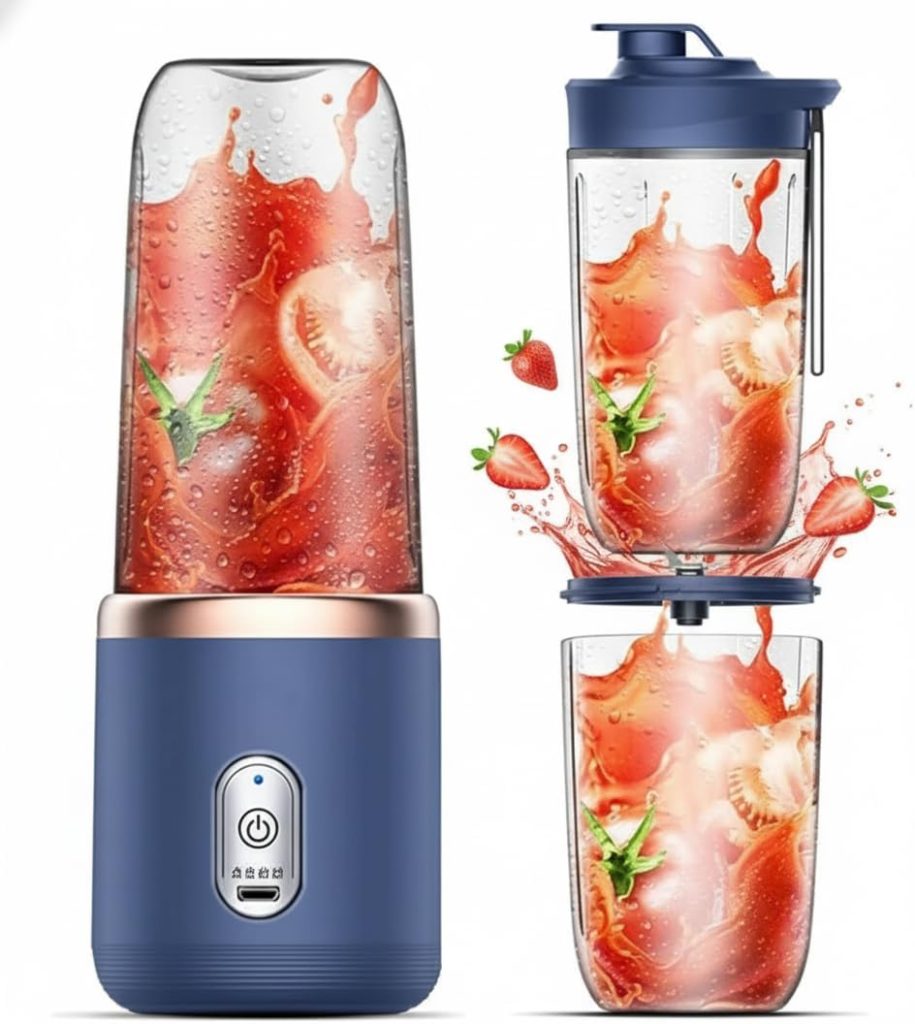 Liquidificador Portátil Mini Mixer, Azul Marinho, 400ml, 6 Lâminas, Batedor de Sucos e Shakes com Copo Extra, Recarregável