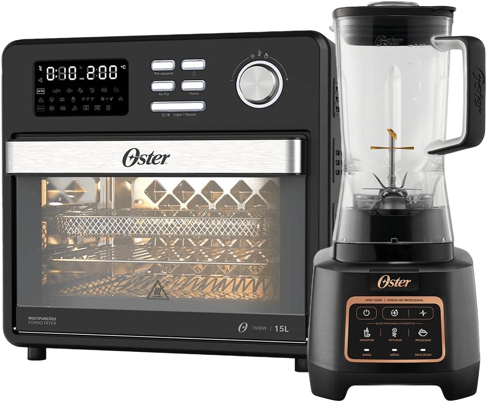 Esse kit contém os seguintes itens:Liquidificador Profissional Xtreme Mix Oster 2L BLSTXPTBWCom lâminas revestidas com titânio, motor reversível de 1500W, programas automáticos iBlend e jarra de 2L em Tritan, ele garante eficiência, durabilidade e resultados surpreendentes em segundos. Tecnologia Patenteada Titanium Blade: O Xtreme Mix possui lâminas de 7cm revestidas com titânio que mantêm o corte afiado por mais tempo e reduzem o desgaste mesmo com uso constante. Com 4 níveis de corte, elas são projetadas para alcançar cada canto do copo, triturando os alimentos com mais precisão, eficiência e rapidez. Poder Para Fazer Mais: Com 3 programas automáticos iBlend e 3 velocidades manuais você pode explorar a cozinha ao máximo, preparando diferentes tipos de receitas de forma fácil e rápida. 3 Velocidades Manuais +Pulso e Pulso Reversível: Ajuste a velocidade de acordo com as suas necessidades. A função de pulso reversível permite que você triture e misture ingredientes com texturas diferentes.Dimensões [LxAxP]: 200x435x235mmSelo de Segurança OCP NCCGarantia (meses): 12Forno e Fryer 15L Oster Multifunções Compact 10 em 1 OFOR160Muito mais praticidade para a sua rotina na cozinha!O Forno Fryer Multifunções Compact da Oster entrega tudo para quem quer sempre mais. São 21 funções e préprogramações que vão levar mais praticidade para a sua cozinha e saúde para a sua rotina. 2 em 1 Forno e Fritadeira: Mais versatilidade e praticidade para seus momentos na cozinha. Com o novo Forno Fryer Multifunções Compact Oster, é possível fritar sem óleo e assar por convecção. 10 Funções Manuais: Fritadeira, Grill, Desidratar, Descongela, Reaquecer, Forno, Grelhar, Turbo Convection, Torrar e Estufa. 11 Funções PréProgramadas: Frango, Peixe, Costela, Camarão, Carne, Asas de Frango, Vegetais, Bacon, Batata Frita, Lasanha e Pizza. Função Turbo Convenção: Mais velocidade na hora de assar. A função convecção garante que a temperatura seja igual por toda a superfície do alimento, proporciona